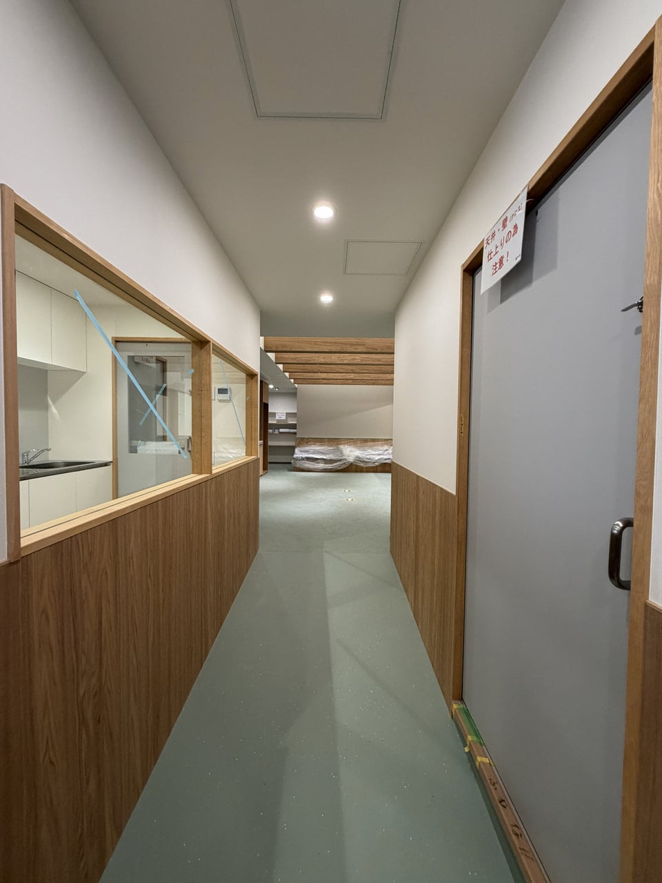 現在、内装工事の最終仕上げが進んでいます。 掲載した写真は、子どもたちが活動するメインルームと廊下の様子です。