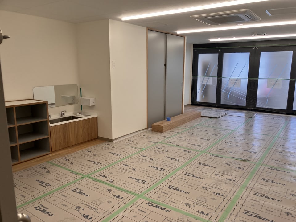 ※現在の写真では、大切な床材を傷つけないよう保護シート(養生)で覆われているため、まだその美しい木肌をお見せすることができません。 養生が外れ、無垢の床が一面に広がる様子は、次回のブログまたは完成後の内覧会や見学等にてお披露目いたします。ぜひ楽しみにお待ちください!