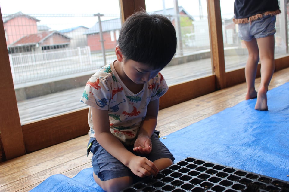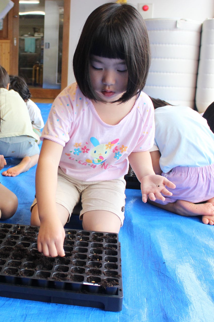 次は、その大切な根を折らないように土へ植える作業です。大人が思わずハラハラするほど繊細な工程でしたが、子どもたちは小さな指先を使い、一粒ずつそっと丁寧に土をかぶせていきました。