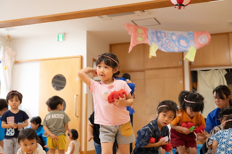 お部屋の中には、カラフルなちょうちんや、年長さんが作ったこいのぼりがゆらゆらと揺れ、まるで本当のお祭り会場のよう。子どもたちは、普段とは違う特別な雰囲気に、目を輝かせていました。