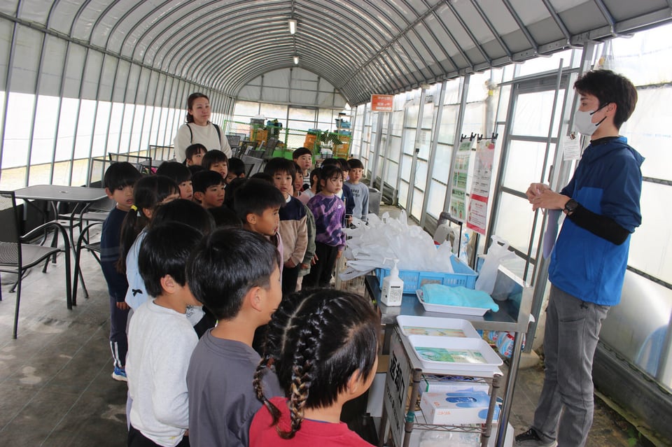 いちごを摘む前に、まずは農園の方から美味しいいちごの見分け方や、収穫のルールを教わりました。背筋を伸ばして真剣な眼差しでお話を聞く姿勢に、もうすぐ小学生になる年長さんらしい頼もしさを感じます。