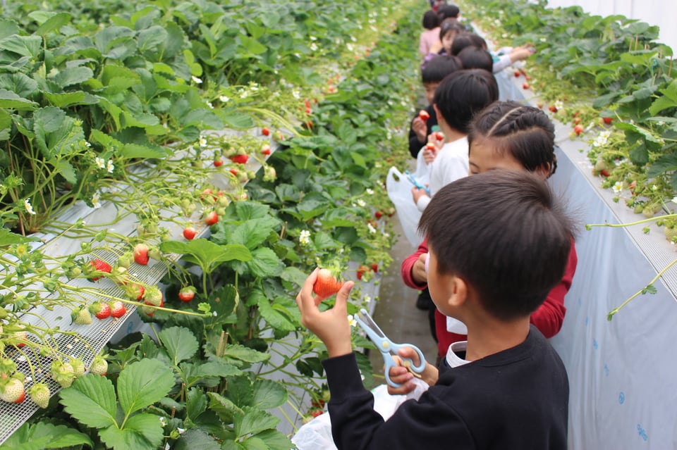 ぽかぽかと暖かいハウスの中に一歩足を踏み入れると、そこには真っ赤に色づいた美味しそうないちごがズラリ!「わぁ、甘い匂いがする!」「大きいの見つけたよ!」と、子どもたちの目はたちまちキラキラと輝き始めます。