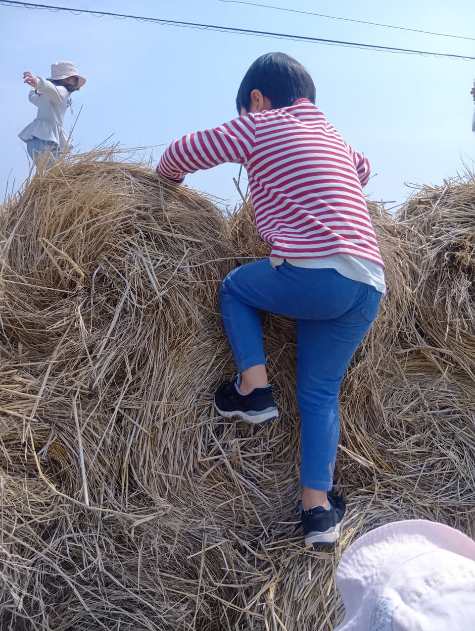 「潰さずに美味しく食べたい!」と思うからこそ、子どもたちは自然と指先をそっと使い、力加減(微細運動)を覚えていきます。また、大きな「わら山」にも挑戦!不安定な足場でバランスを取りながらよじ登ることで、しなやかな体づくり(粗大運動)と豊かな感覚が養われます。