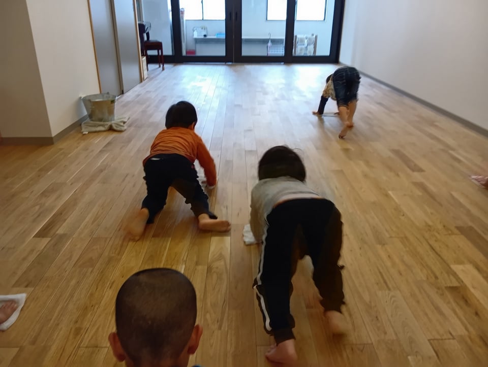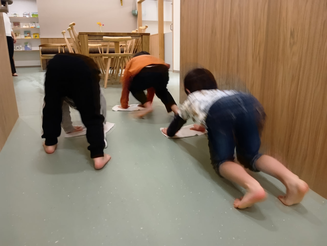 広い活動室で、子どもたちは雑巾を手に勢いよく床を滑らせます。