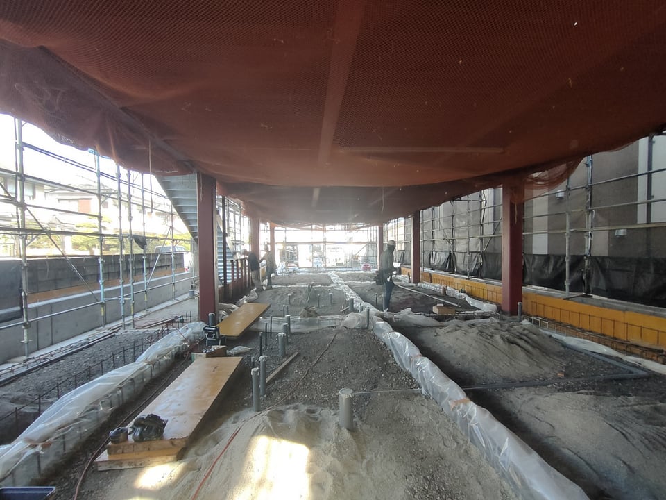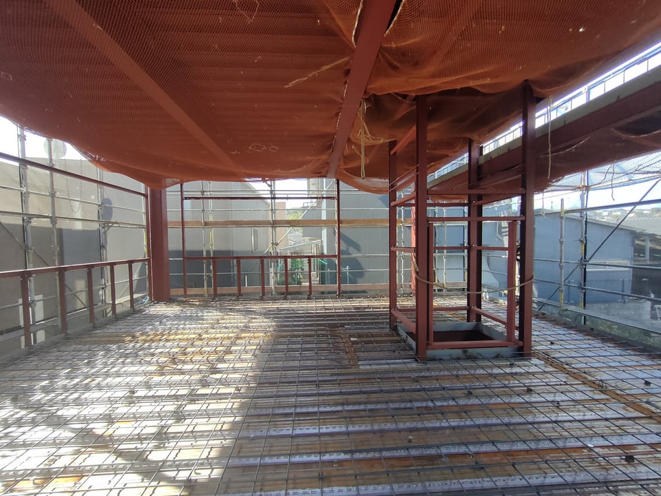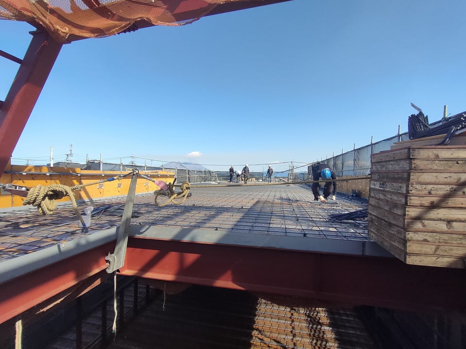現場では、鉄骨が組み上がり、建物の形がはっきりと見えてきました。現在は、床や壁を作るための作業が進められており、職人さんが丁寧に鉄筋を組んでいる様子が見られます。安全ネットの下、基礎部分から着実に工事が進んでいることに、完成への期待が高まります。