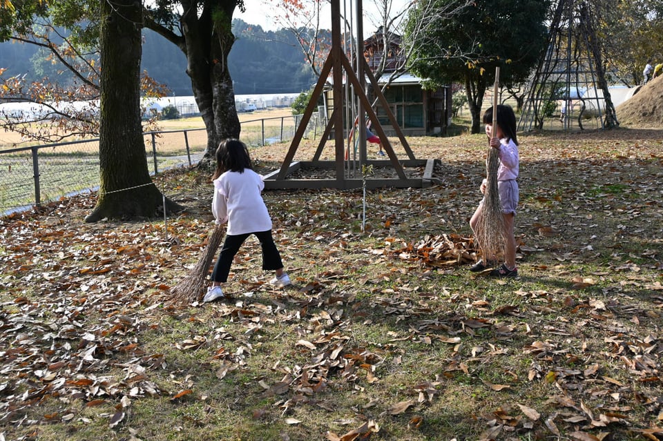 遊びを満喫した後は、年長さんたちの出番です。 竹箒を手に、職人顔負けの真剣な表情でお掃除タイム。「楽しませてくれてありがとう」の気持ちを込めて、園庭をきれいにしてくれました。
