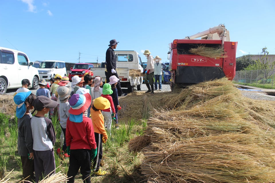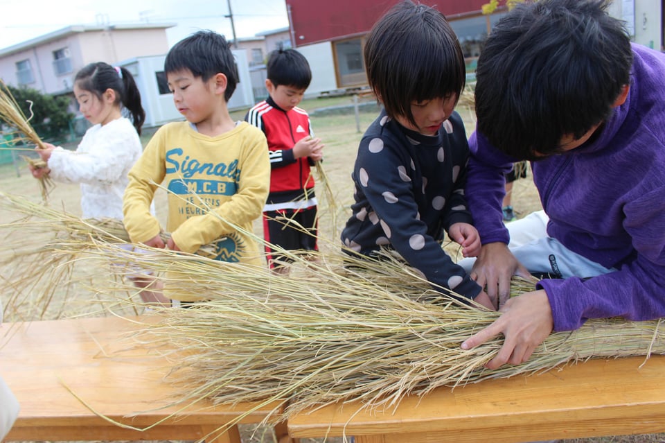 今回は年長クラスの子どもたちが、自分たちで刈り取った「藁(わら)」を使った、お正月の「しめ縄作り」に挑戦しました。