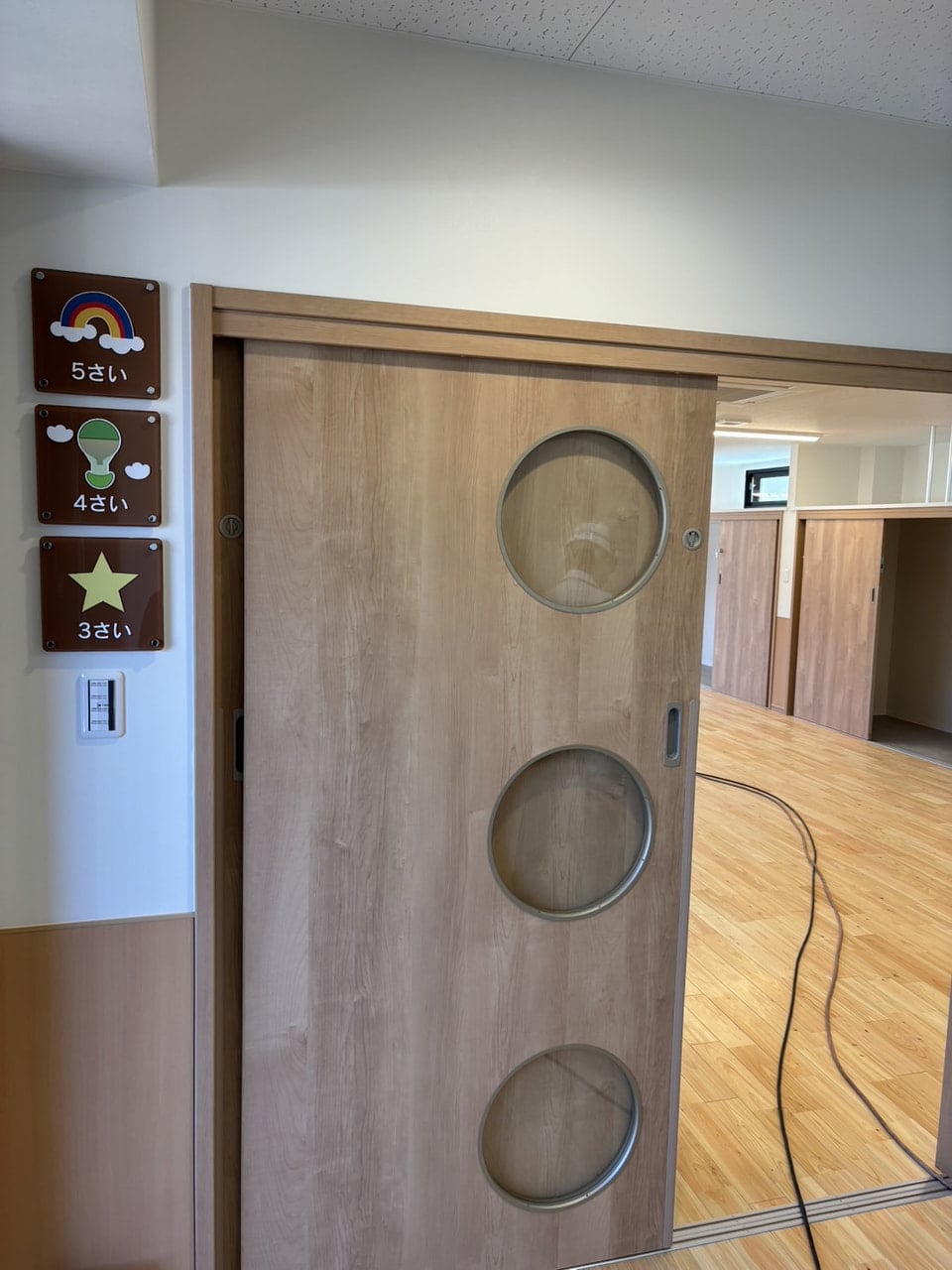 丸い小窓がついた引き戸の横には、「3さい」「4さい」「5さい」と可愛らしいクラスサインも設置され、保育園らしいワクワクする空間がどんどん形になってきました。